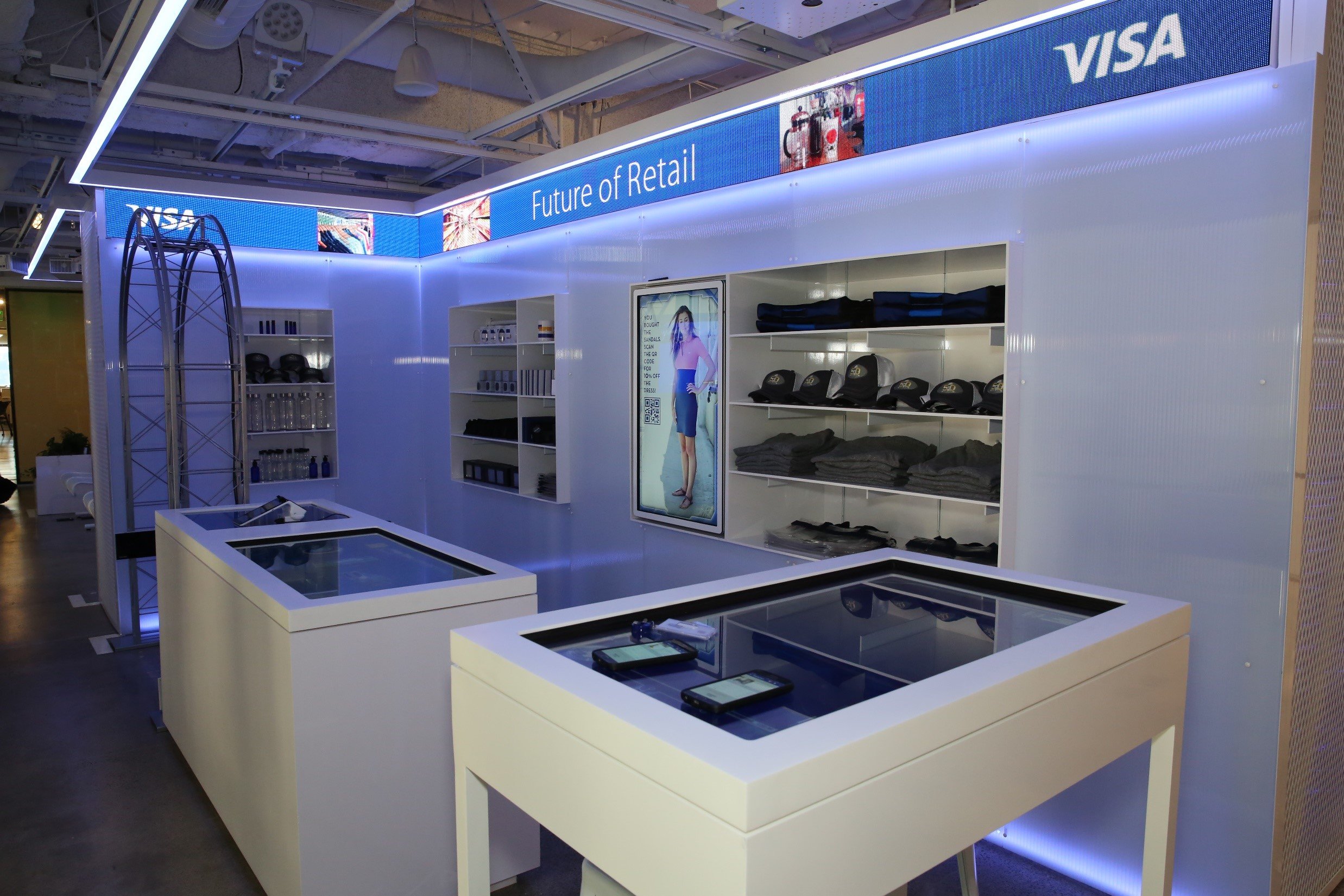 This demonstration at Visa’s San Francisco headquarters included a checkout gate, which sensed products in your bag and showed your cart on a nearby screen.