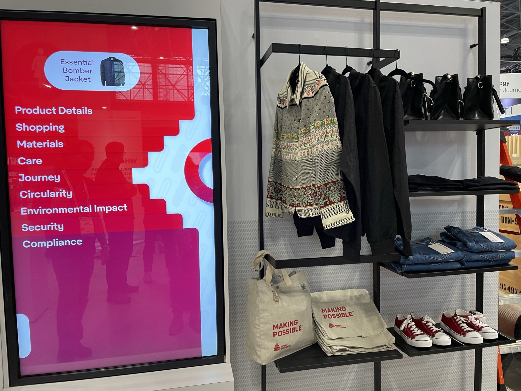 A retail rack with tagged items that trigger deep content about each product’s provenance, materials, care, related products, sustainability measures, circularity compliance, and much more. This demonstration was in Avery Dennison’s 2025 NRF booth on the show floor.